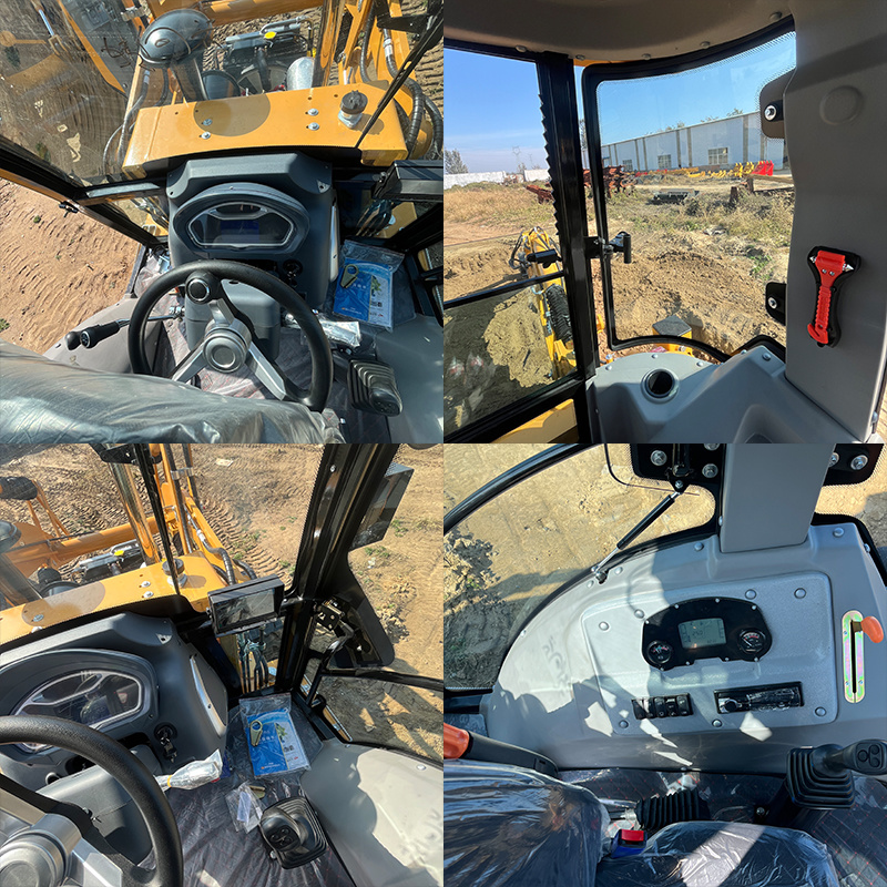 Cabine fechada redesenhada, com maior espaço interno e campo de visão ampliado para o operador, equipada com estrutura de proteção ROPS/FOPS, conforme normas aplicáveis, equipada com ar-condicionado e aquecedor